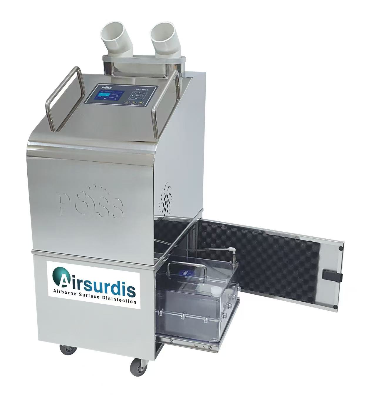 POSS超微粒灭菌器采用创新的超频波震动技术(1.6MHz),将常温消毒液转化为3微米的超微颗粒,实现均匀扩散和6个log的高效微生物杀灭率,确保空间灭菌无死角。